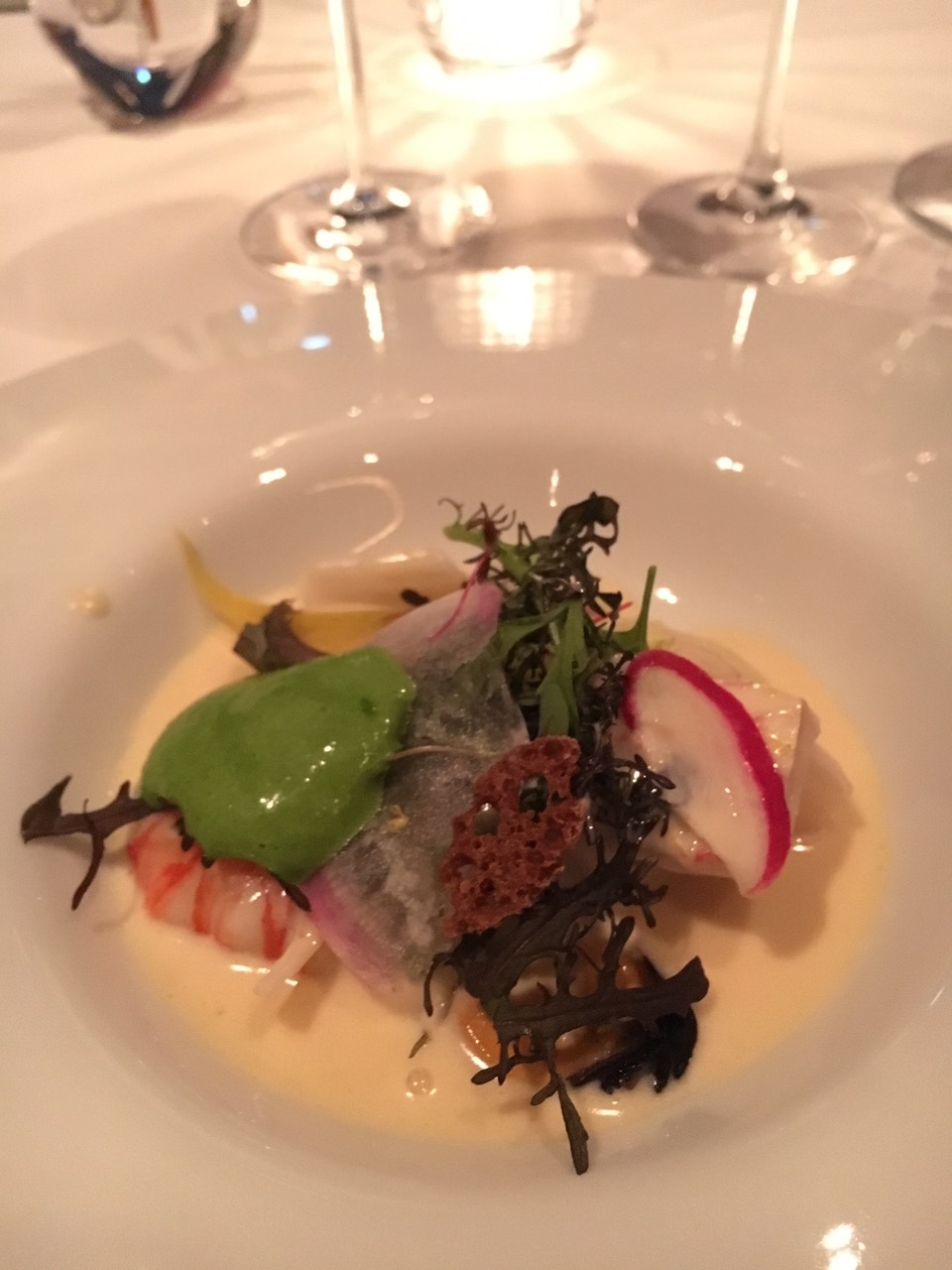 ビジュアルに注目です。ソースで木の葉を、周りの粉(オリーブオイルらしいです!)で雪を表現しています。