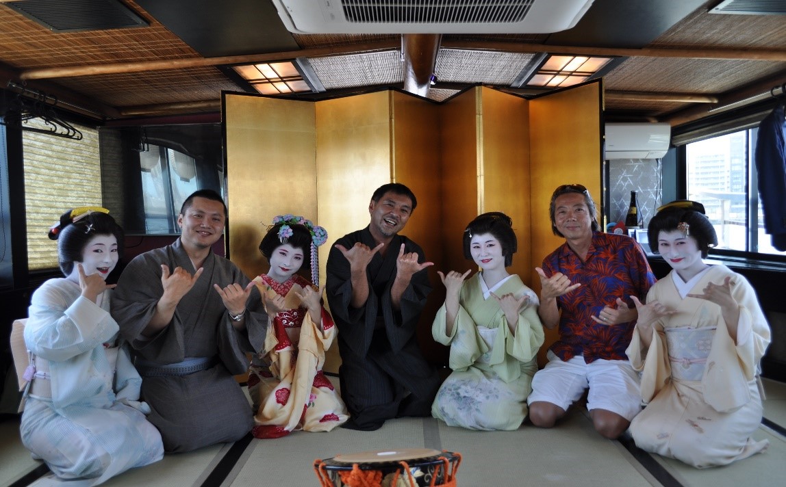 初夏を向かえた猛暑日の中、品川の舟屋「大江戸」の屋形船を貸し切り、大井海岸の芸者衆3名をお呼びしお座敷遊びの会を開催致しました。30名程の方にご参加頂いた上、浴衣のレンタルもご用意し、参加者全員が浴衣という夏を感じる交流会となりました。