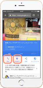 検索結果の店舗をタップすると、店舗の情報と共に電話や経路などのボタンが表示されます。