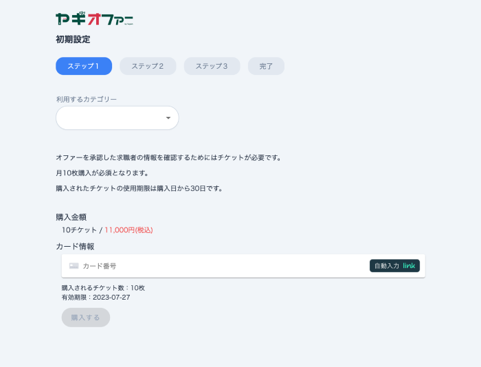 決済完了後は、【企業タイプ】、【勤務環境】、【予定勤務地】、【業種】、【職種】を決定してください。その後、貴社の会社ロゴ、会社説明、会社紹介資料、ホームページを設定すればオファーを送る準備は完了です。