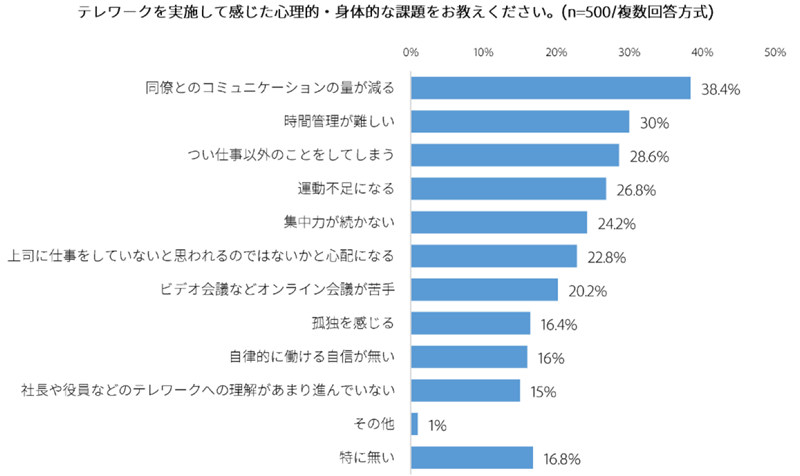 アドビ社では、コロナウイルスの蔓延による騒ぎが起こる直前に「テレワーク中の心理的・身体的課題」も調査しています。