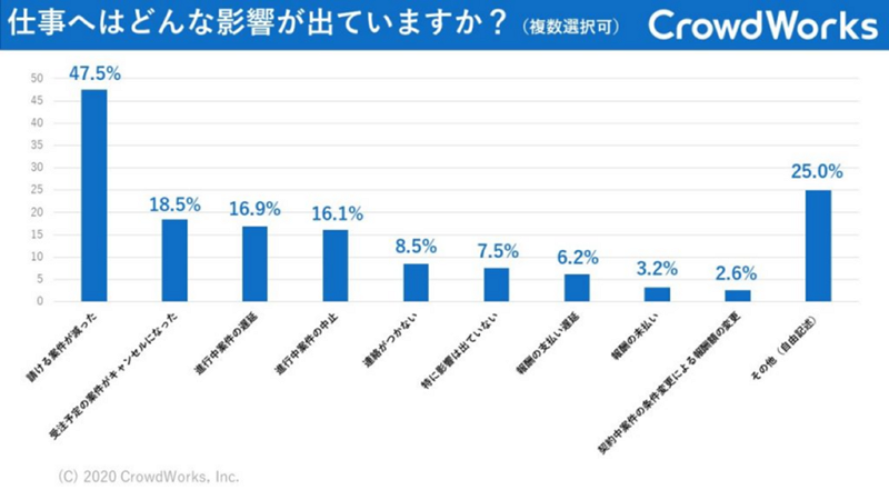 クラウドソーシングサービスを提供する「クラウドワークス」は、1400人のフリーランスに対して新型コロナウイルス感染拡大による影響を調査。