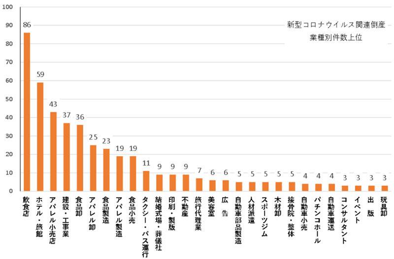 事実、帝国データバンクが公表した業種別のコロナ関連倒産件数は、「飲食」、「宿泊」、「小売り」が多くを占めています。