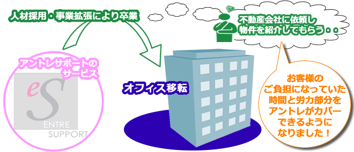 起業時に当社のサービスを利用して頂くお客様は、会社が軌道に乗り、人材を雇用するなど事業規模が大きくなると、レンタルオフィス、シェアオフィスや他のサービスが手狭になり賃貸事務所へ移転されていきます。