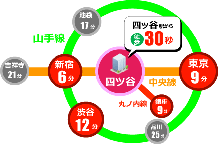 1、「四ツ谷オフィス」「四ツ谷六番町オフィス」はJR「四ツ谷駅」徒歩30秒という好立地にあり、JR 中央線・総武線・東京メトロ丸の内線・南北線の計4線が利用でき、さらに都内の主要駅である新宿駅や東京駅まで約10分以内と、電車でのアクセス環境も抜群です。