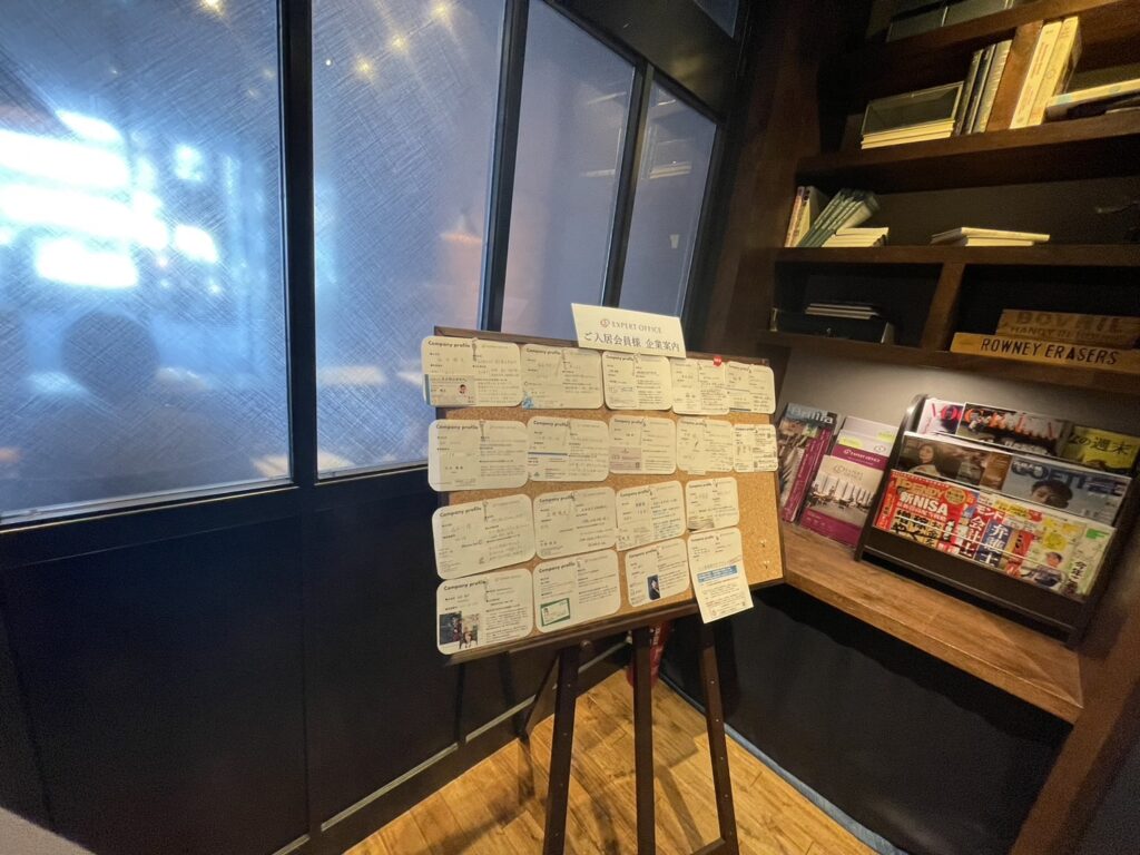 ラウンジには、入居している企業のプロフィールシートが貼り出されています。