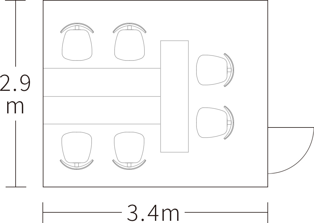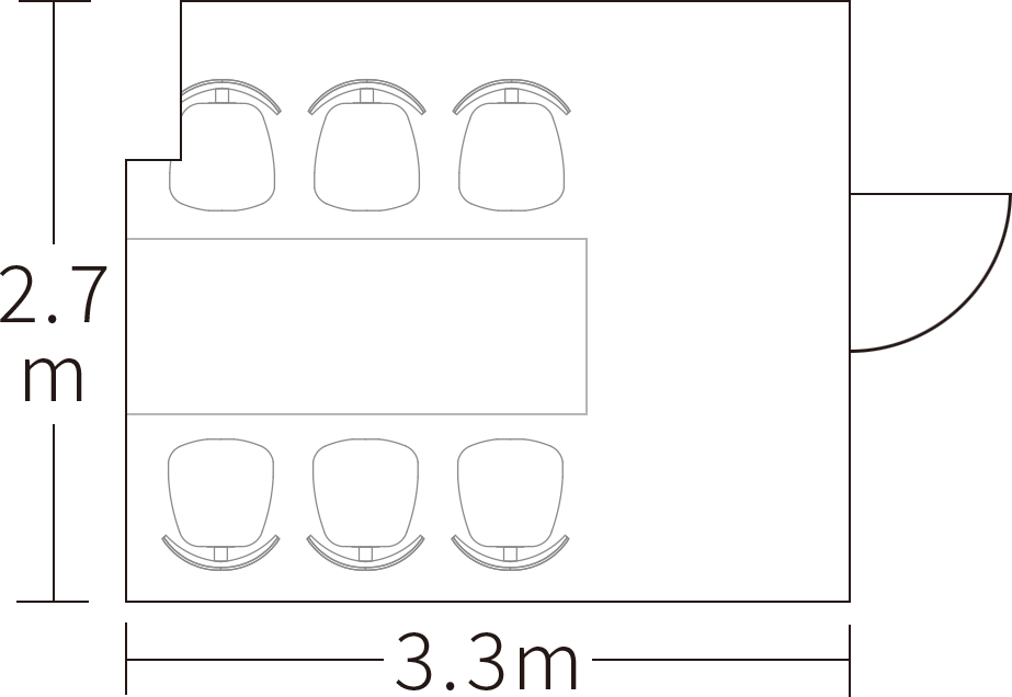 | 設備 | ・ホワイトボード1つ ・テーブル1つ ・チェアー6脚 ・個別空調 ・Wi-Fi |
