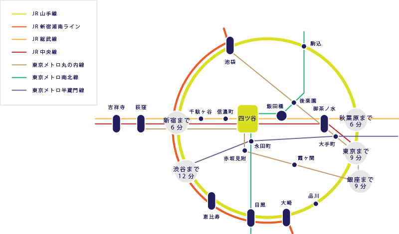 JR 中央線 ・ 総武線 ・ 丸の内線 ・ 南北線が利用でき、
