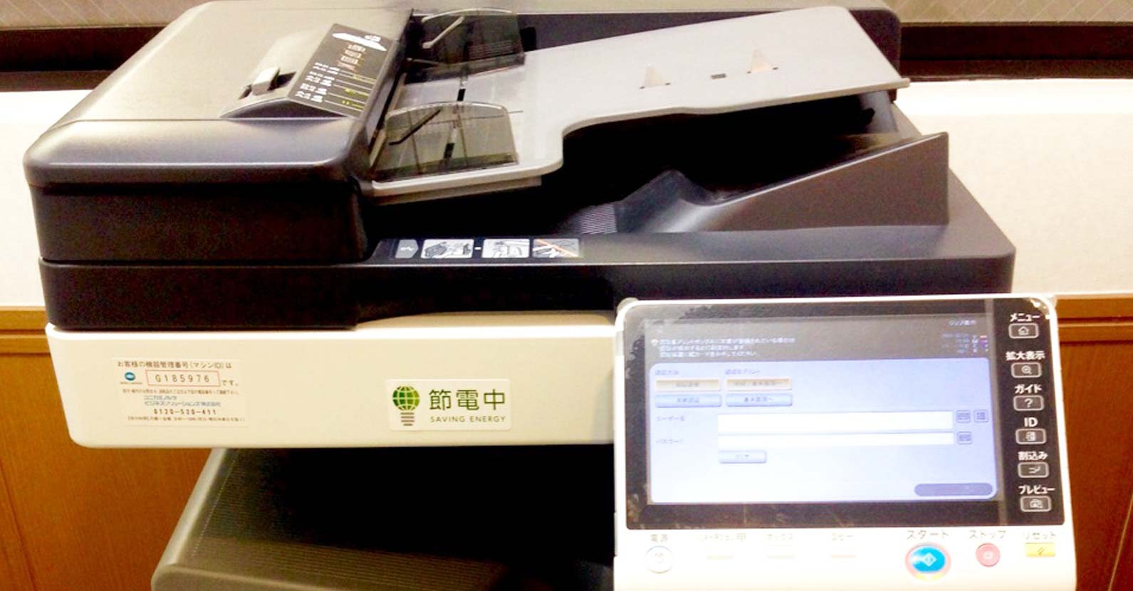 ICカード対応の複合機をフロアに設置しています。プリント、コピー、スキャンが利用可能(最大A3サイズ)。