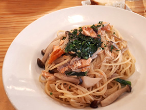 この日のパスタは、きのことほうれん草、サーモンのパスタ。セットでパンが付いてきます。 |