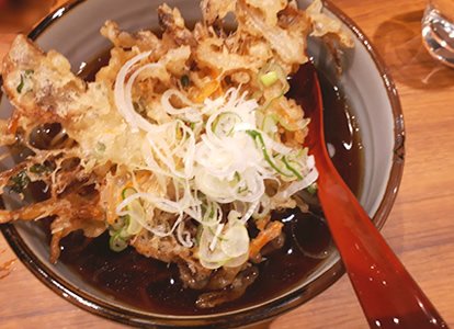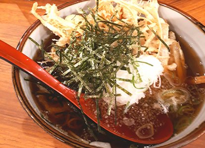 ごぼうたっぷり!大根おろしと刻み海苔がトッピングされています。ささがきのごぼう天は、そのまま食べればパリパリサクサク。おつゆに浸せばしっとりと衣がとろけます。 |