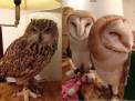 キレイな双子のメンフクロウ。大きなユーラシアンワシミミズク、小さなモリフクロウなど8種類くらいのフクロウたちがお出迎えしてくれます。