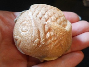 タイの最中アイスクリーム。お魚の鯛を模した最中の中にさつまいもとかぼちゃのアイスクリームが入っています。 |