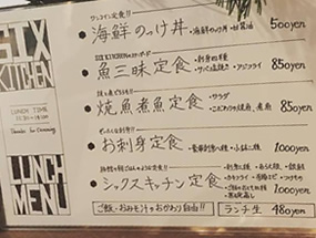 他には、魚三昧定食、焼魚煮魚定食各、お刺身定食、シックスキッチン定食。